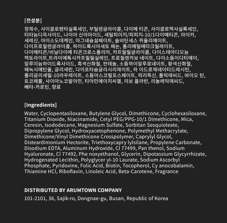주요 성분 정제수, 사이클로펜타실록세인, 부틸렌글라이콜, 다이메 티콘, 사이클로헥사실록세인, 티타늄디옥사이드, 나이아 신아마이드, 세틸피이지/피피지-10/1다이메티콘, 마이카, 세레신, 아이소도데케인, 마그네슘설페이트, 솔비탄세스 퀴올리에이트, 다이프로필렌글라이콜, 하이드록시아세토 페논, 폴리메틸메타크릴레이트, 다이메티콘/비닐다이메 티콘크로스폴리머, 카프릴릴글라이콜, 다이스테아디모늄 헥토라이트,트라이에톡시카프릴릴실레인, 프로필렌카보 네이트, 다이소듐이디티에이, 알루미늄하이드록사이드, 흑색산화철, 판테놀, 소듐하이알루로네이트, 황색산화철, 페녹시에탄올, 글리세린, 다이포타슘글리시리제이트, 하 이드로제네이티드레시틴, 폴리글리세릴-10라우레이트, 소듐아스코빌포스페이트, 피리독신, 폴릭애씨드, 바이오 틴, 토코페롤, 사이아노코발아민, 티아민에이치씨엘, 리보 플라빈, 리놀레익애씨드, 베타-카로틴, 향료