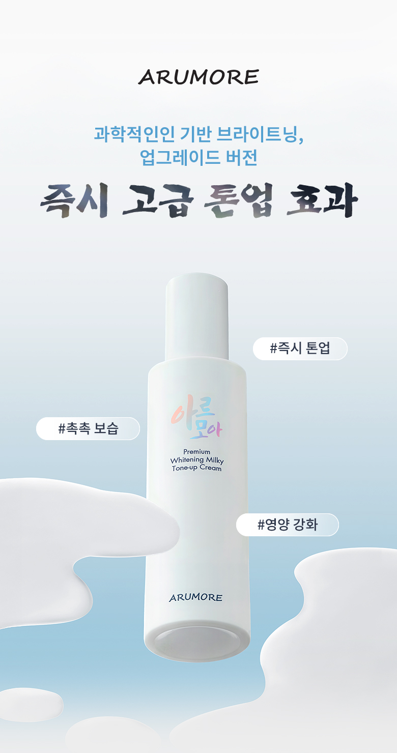 아루모어 프리미엄 화이트닝 밀키 톤업 크림 200ML (Arumore Premium Tone-up Cream 200ML) 은 피부를 하얗고 자연스럽게 매끈하게 균일하게 착색시켜줍니다. 동시에 피부에 수분을 공급하여 촉촉하고 매끄러워지며, 멜라닌 색소 생성을 감소시켜 기미, 주근깨를 효과적으로 옅어줍니다.
