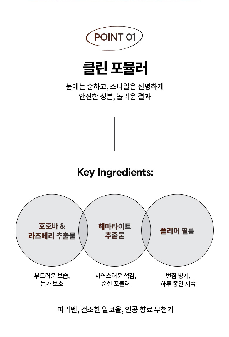- 카본 블랙 (CI 77266) & 산화철: 깊고 선명한 블랙 컬러를 연출하며, 외부 자극에 강한 지속력을 제공합니다.